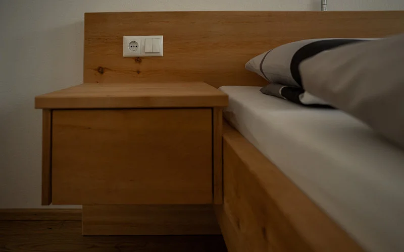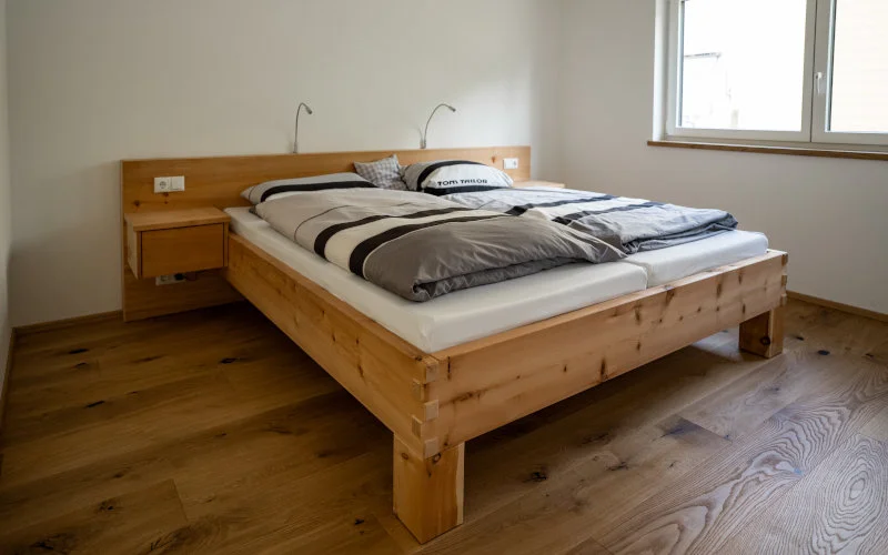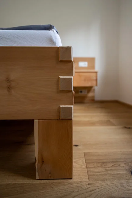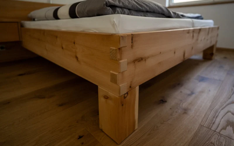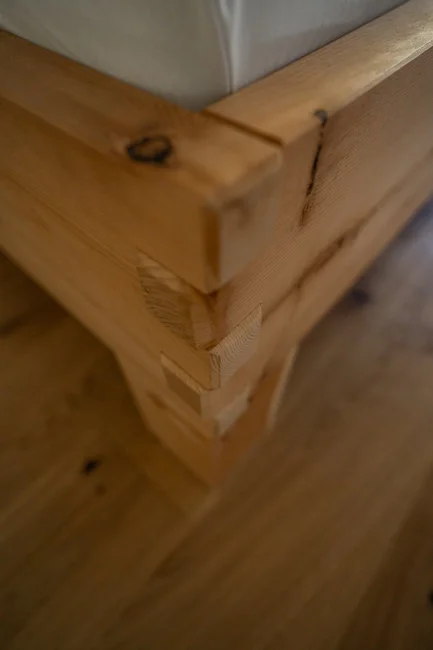 Ein besonderes Merkmal dieses Bettes sind die sichtbaren Eckverzinkungen, die nicht nur für eine äußerst stabile Verbindung der Bauteile sorgen, sondern auch ein charakteristisches gestalterisches Element darstellen. Diese traditionelle Holzverbindung unterstreicht die handwerkliche Qualität und verleiht dem Bett eine markante, hochwertige Optik.