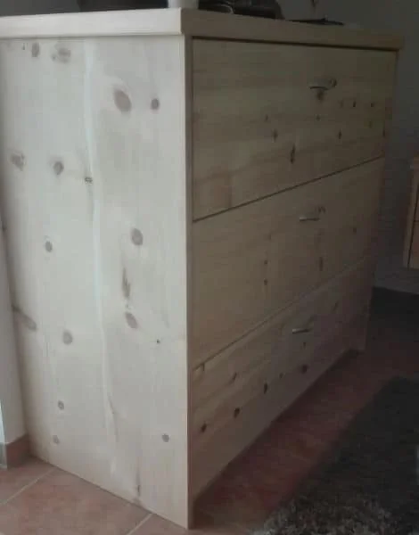 Das Schlafzimmer besteht aus einem harmonisch abgestimmten Möbelset aus Doppelbett, zwei Kommoden und Kleiderschrank, gefertigt aus massiver Fichte. Die natürliche Holzstruktur und die helle Farbgebung der Fichte verleihen dem Raum eine freundliche, warme und ruhige Atmosphäre.