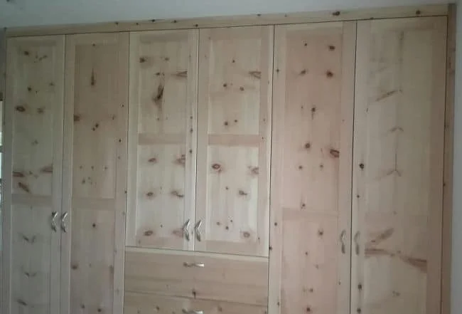 Das Doppelbett bildet das zentrale Element des Schlafzimmers und überzeugt durch seine stabile Bauweise sowie die natürliche Ausstrahlung des Holzes. Ergänzt wird es durch zweie Kommoden, die zusätzlichen Stauraum für Kleidung, Wäsche oder persönliche Gegenstände bietet. Der geräumige Kleiderschrank sorgt für eine übersichtliche Aufbewahrung von Kleidung und rundet die Einrichtung funktional ab.